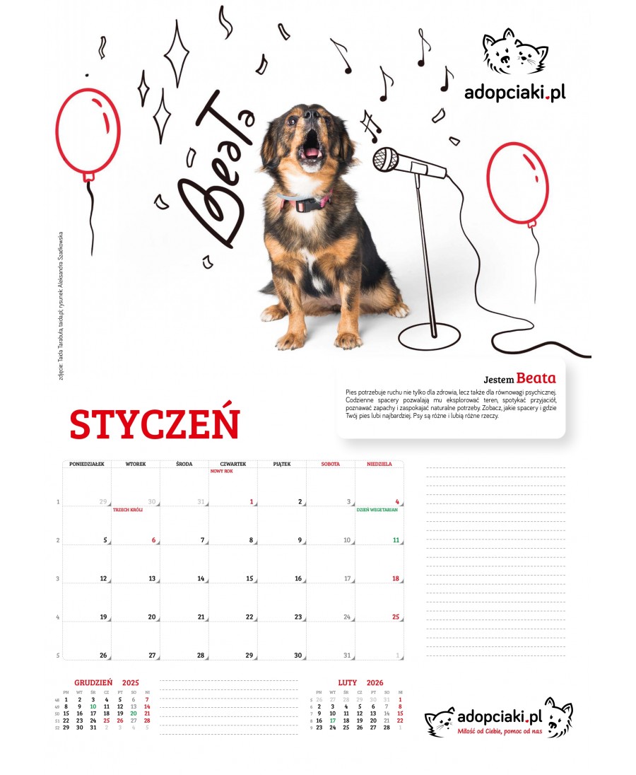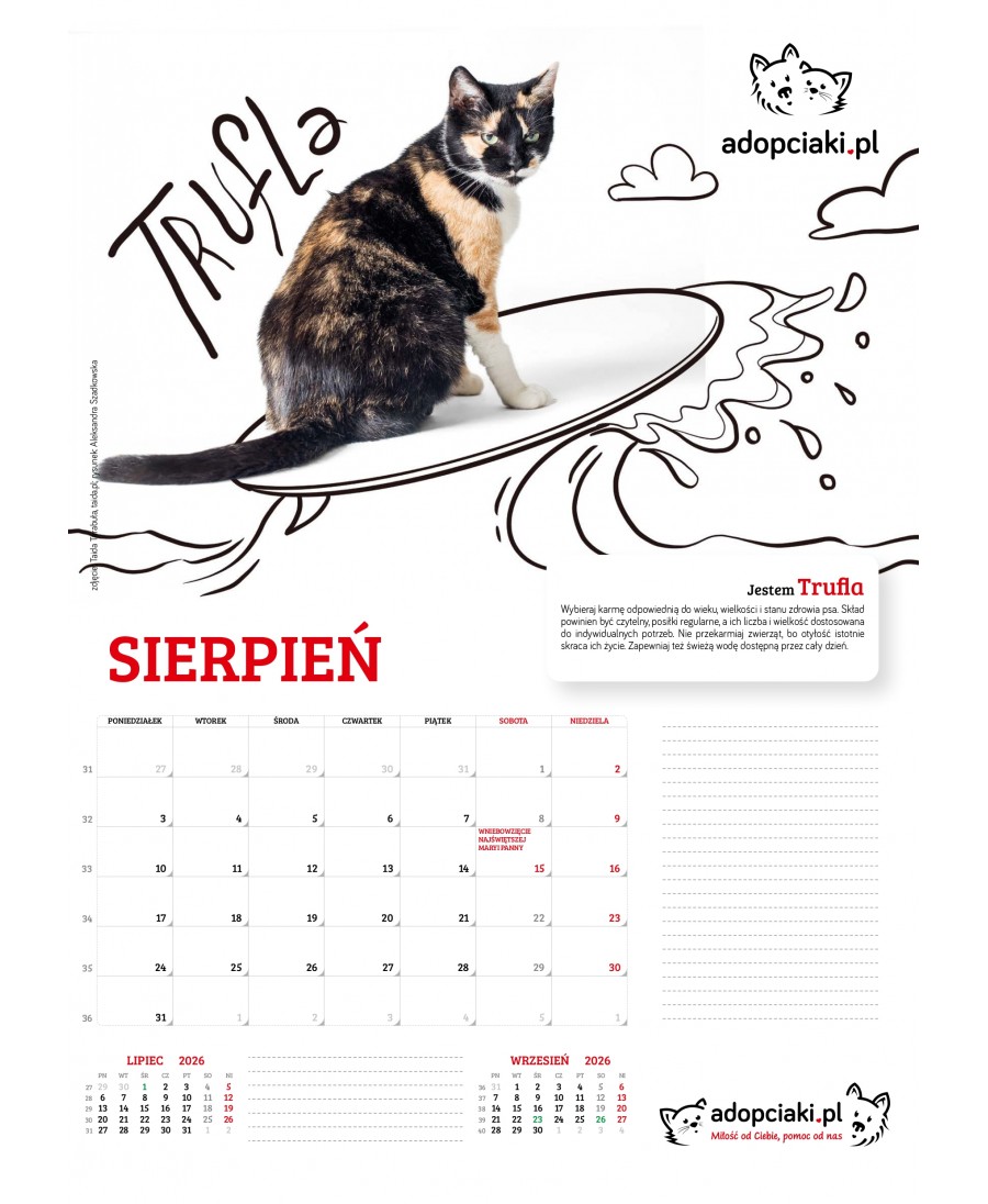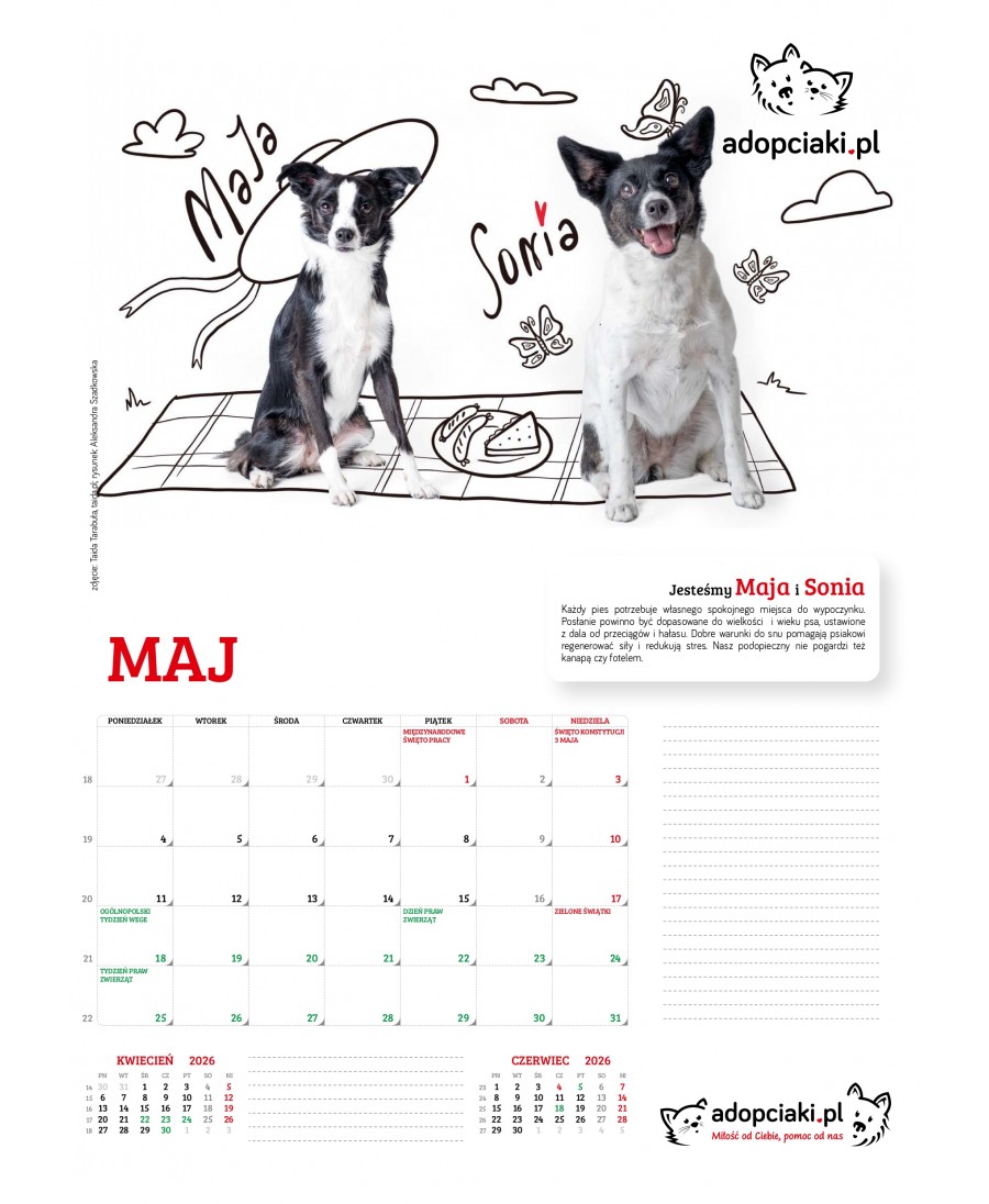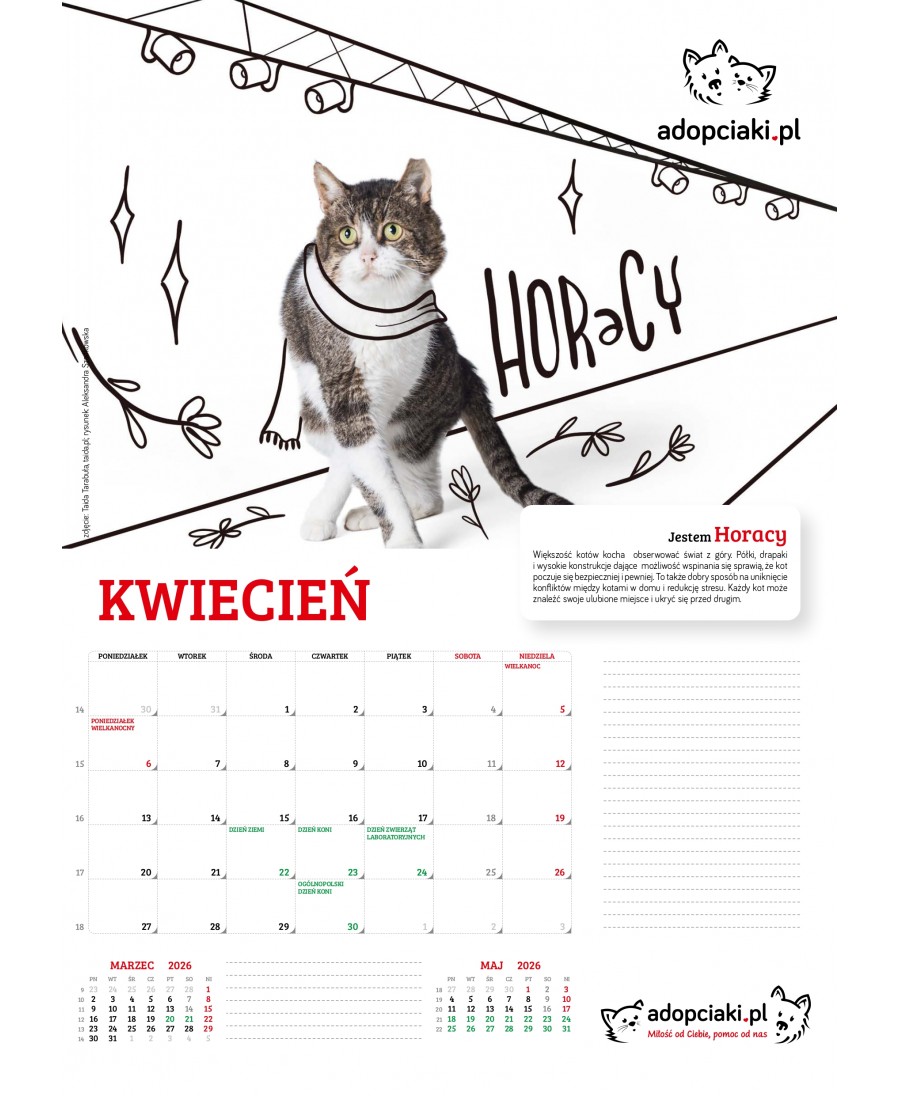 Nieśmiałe i żywiołowe, spokojne i radosne, mało aktywne i ciekawe świata. Wszystkie wspaniałe. Takie są Adopciaki, które pozowały do tego kalendarza. Psy i koty, małe i duże, młodziutkie i starsze, a wszystkie przeurocze. Jeden cudowny zwierzak na każdy miesiąc 2026 roku! Przez cały rok, codziennie będą Was wzruszać i poprawiać nastrój.