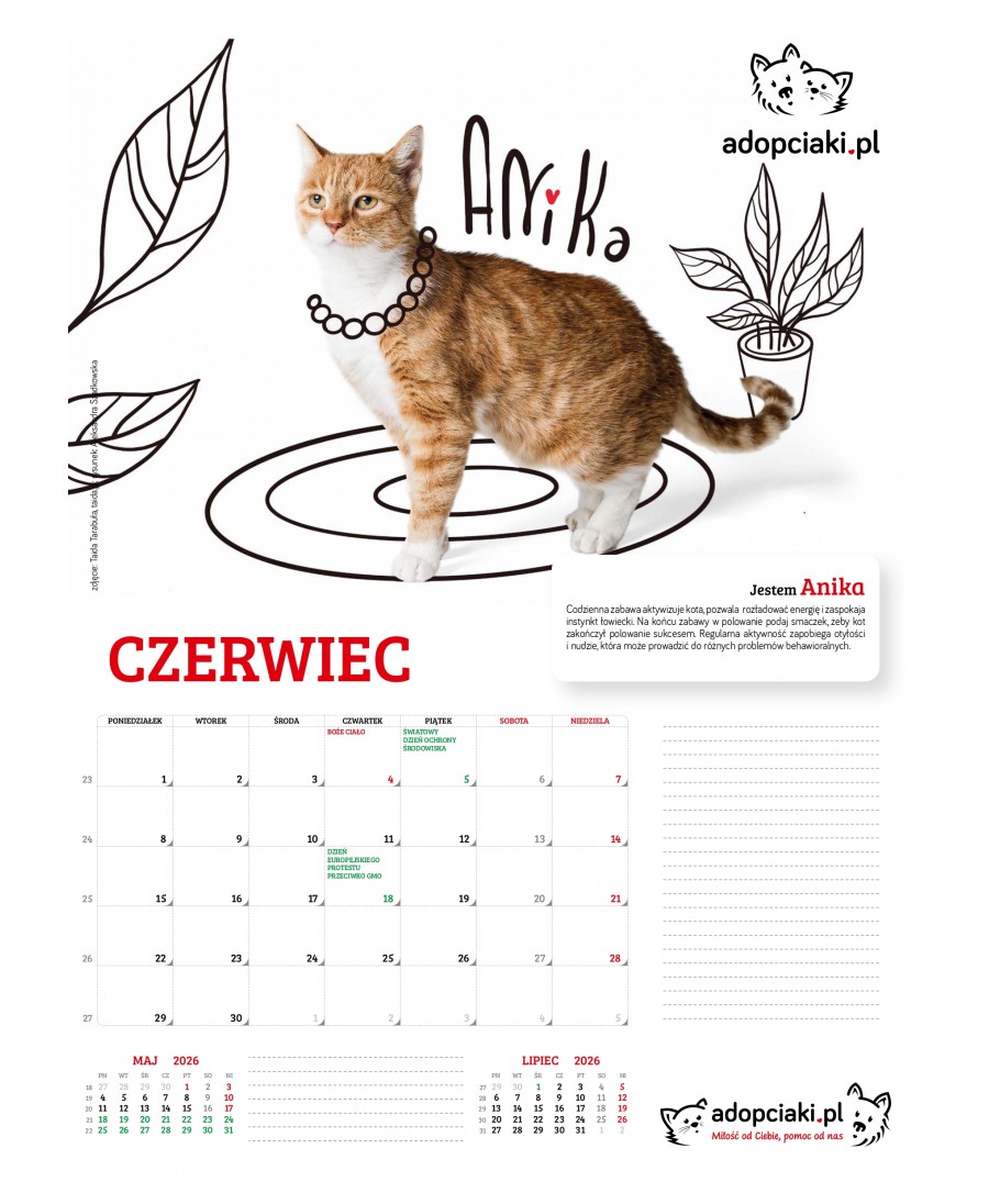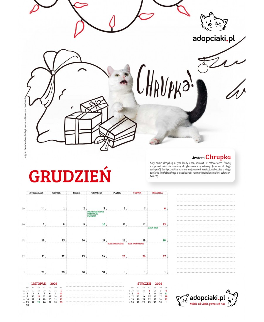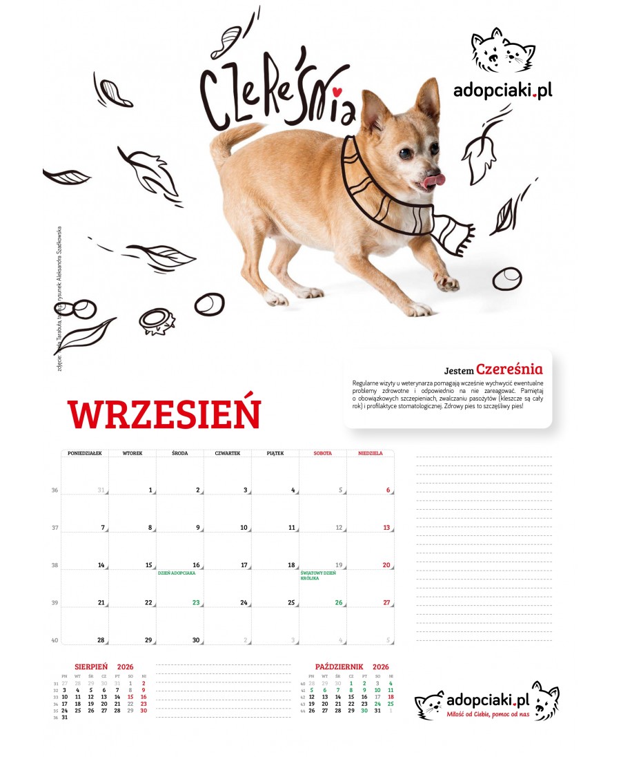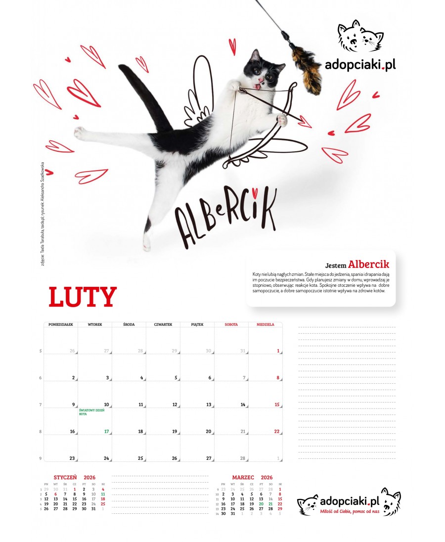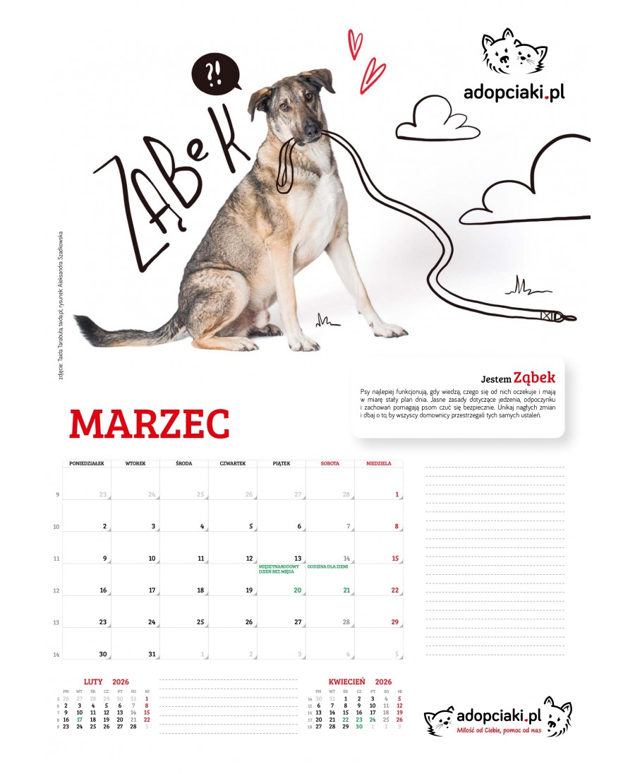 Nieśmiałe i żywiołowe, spokojne i radosne, mało aktywne i ciekawe świata. Wszystkie wspaniałe. Takie są Adopciaki, które pozowały do tego kalendarza. Psy i koty, małe i duże, młodziutkie i starsze, a wszystkie przeurocze. Jeden cudowny zwierzak na każdy miesiąc 2026 roku! Przez cały rok, codziennie będą Was wzruszać i poprawiać nastrój.