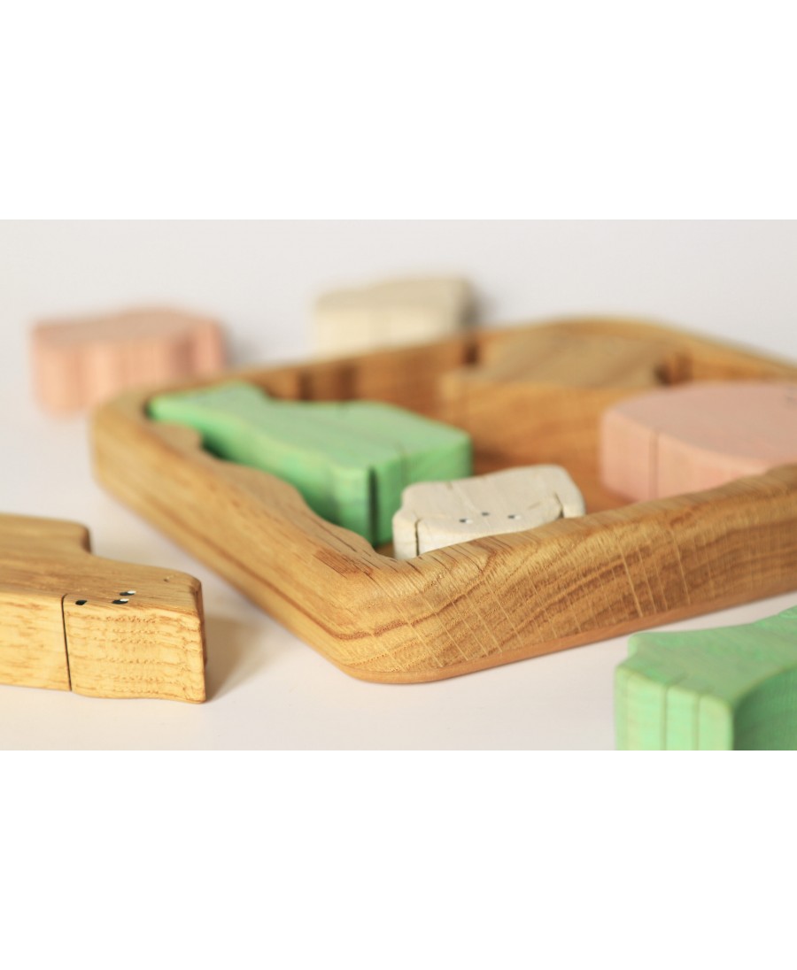 Ta drewniana układanka wykonana jest z naturalnego dębu i składa się z 8 elementów o różnych kształtach i kolorach. Drewniane puzzle pomogą Twojemu dziecku poznać nazwy zwierząt, ich kształty, wielkość i kolor. To świetny sposób na rozwijanie wyobraźni i kreatywności poprzez odgrywanie ról. Figurki zwierząt pomagają także rozwijać umiejętności motoryczne i mowy.
